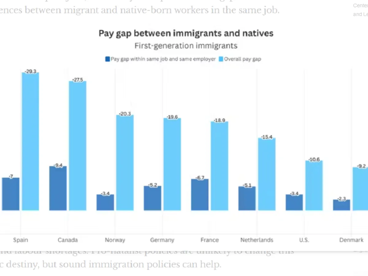 Cu toate acestea, un nou studiu a constatat că salariile imigranților din Europa și America de Nord sunt cu aproape 18% mai mici decât cele ale localnicilor, deoarece lucrătorii născuți în străinătate se luptă să acceseze locuri de muncă mai bine plătite. Pentru a ajunge la această concluzie, s-au analizat salariile a 13,5 milioane de persoane din nouă țări care primesc imigranți: Canada, Danemarca, Franța, Germania, Țările de Jos, Norvegia, Spania, Suedia și Statele Unite.