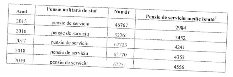 Valoarea medie brută a pensiei de serviciu a cunoscut și ea o creștere semnificativă cu 1.572 de lei, de la 2.984 lei, acum cinci ani, la 4.556 lei, în 2019.