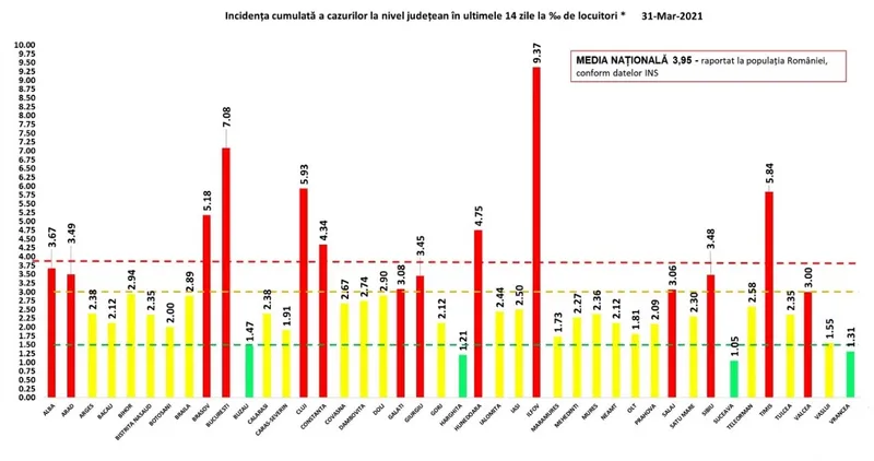 Coeficientul infectărilor cumulate la 14 zile, raportate la 1.000 de locuitori este calculat de către Direcțiile de Sănătate Publică, la nivelul Municipiului București și al județelor. Mai jos aveți graficul realizat în baza raportărilor primite de CNCCI de la Direcțiile de Sănătate Publică: