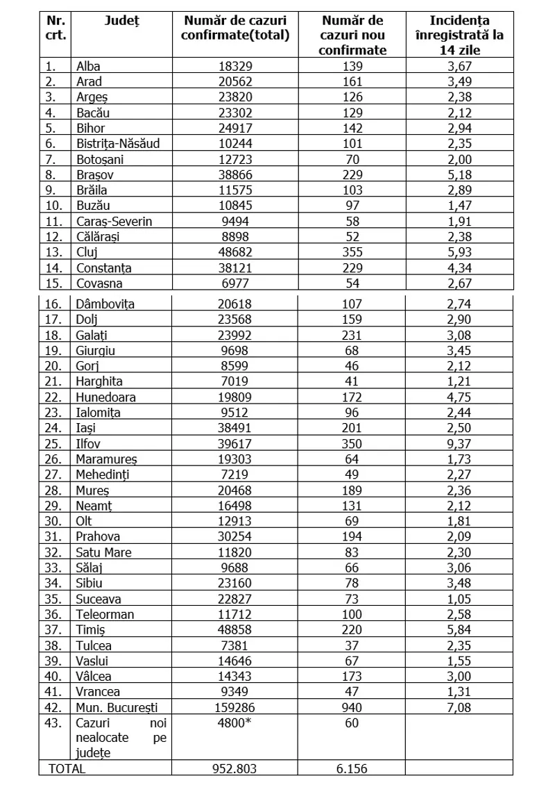 În ultimele 24 de ore, au fost confirmate 6.156 de cazuri noi de infectare cu coronavirus, cele mai multe fiind în București - 940, Cluj - 355, Ilfov - 350, Galați - 231, Brașov - 229, Timiș - 220, Iași - 201.