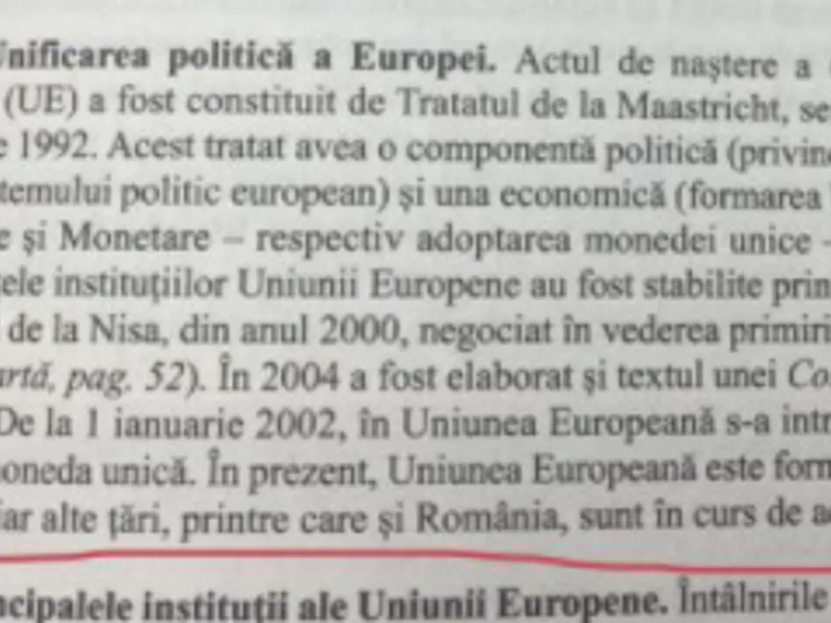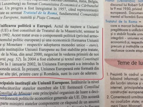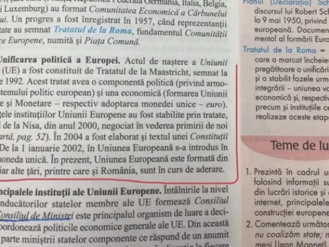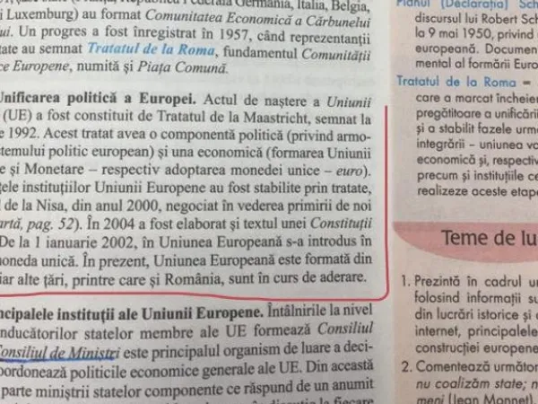 Într-o carte de istorie destinată elevilor de clasa a XI-a a fost identificat un fragment în care nu este menționată apartenența României la UE: „În prezent, Uniunea Europeană este formată din 25 de state iar alte țări, printre care și România, sunt în curs de aderare.”
