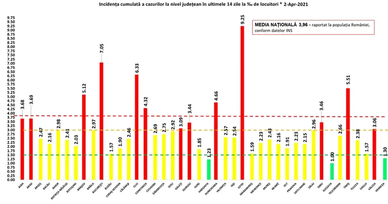 Coeficientul infectărilor cumulate la 14 zile, raportate la 1.000 de locuitori este calculat de către Direcțiile de Sănătate Publică, la nivelul Municipiului București și al județelor. Mai jos aveți graficul realizat în baza raportărilor primite de CNCCI de la Direcțiile de Sănătate Publică: