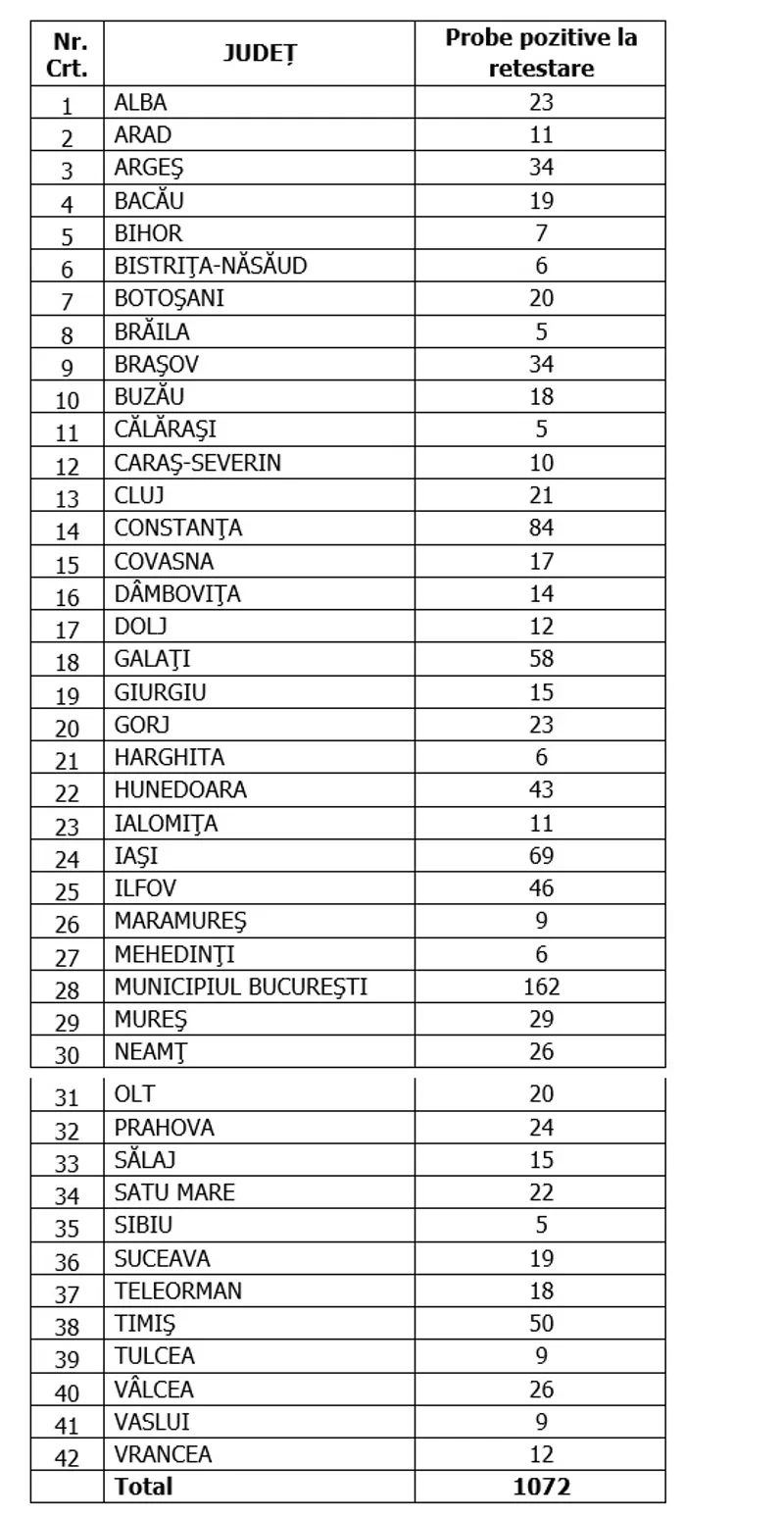 Distinct de cazurile nou confirmate, în urma retestării pacienților care erau deja pozitivi, 1.072 de persoane au fost reconfirmate pozitiv.