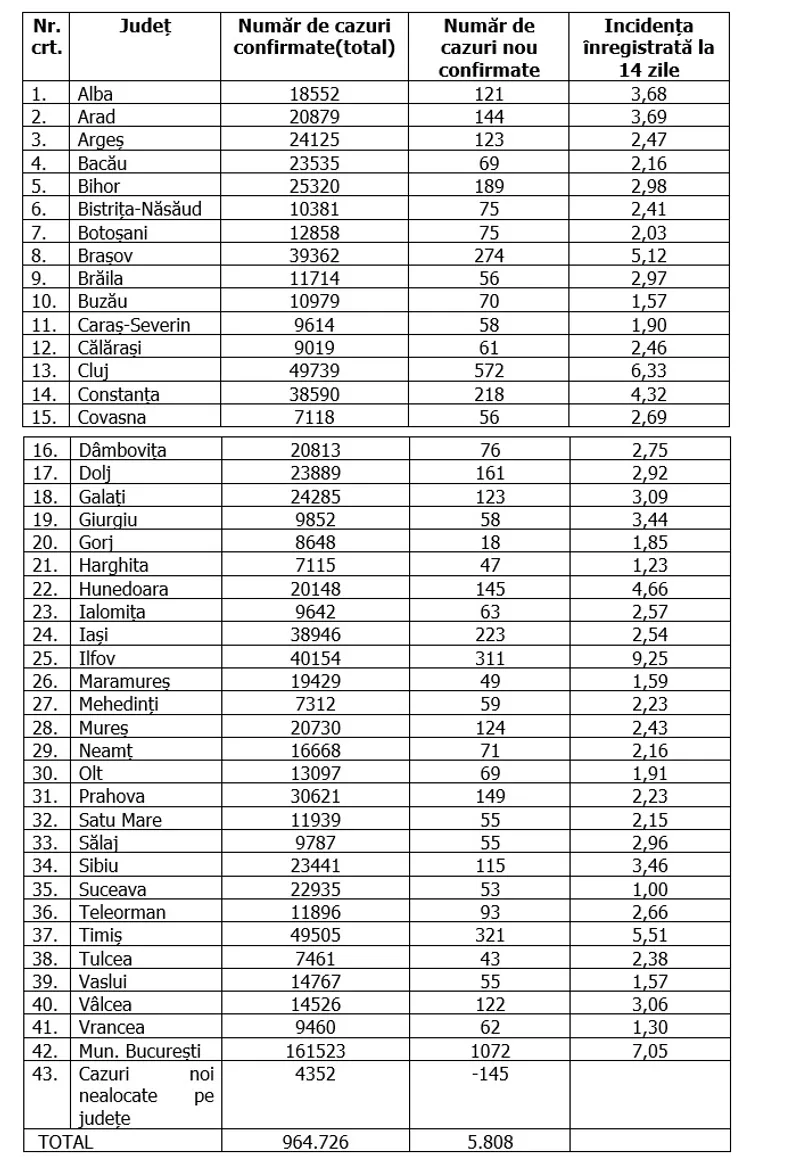 În total, în România au fost confirmate 964.726 de cazuri de infectare cu coronavirus, iar 23.819 de oameni infectați au murit.