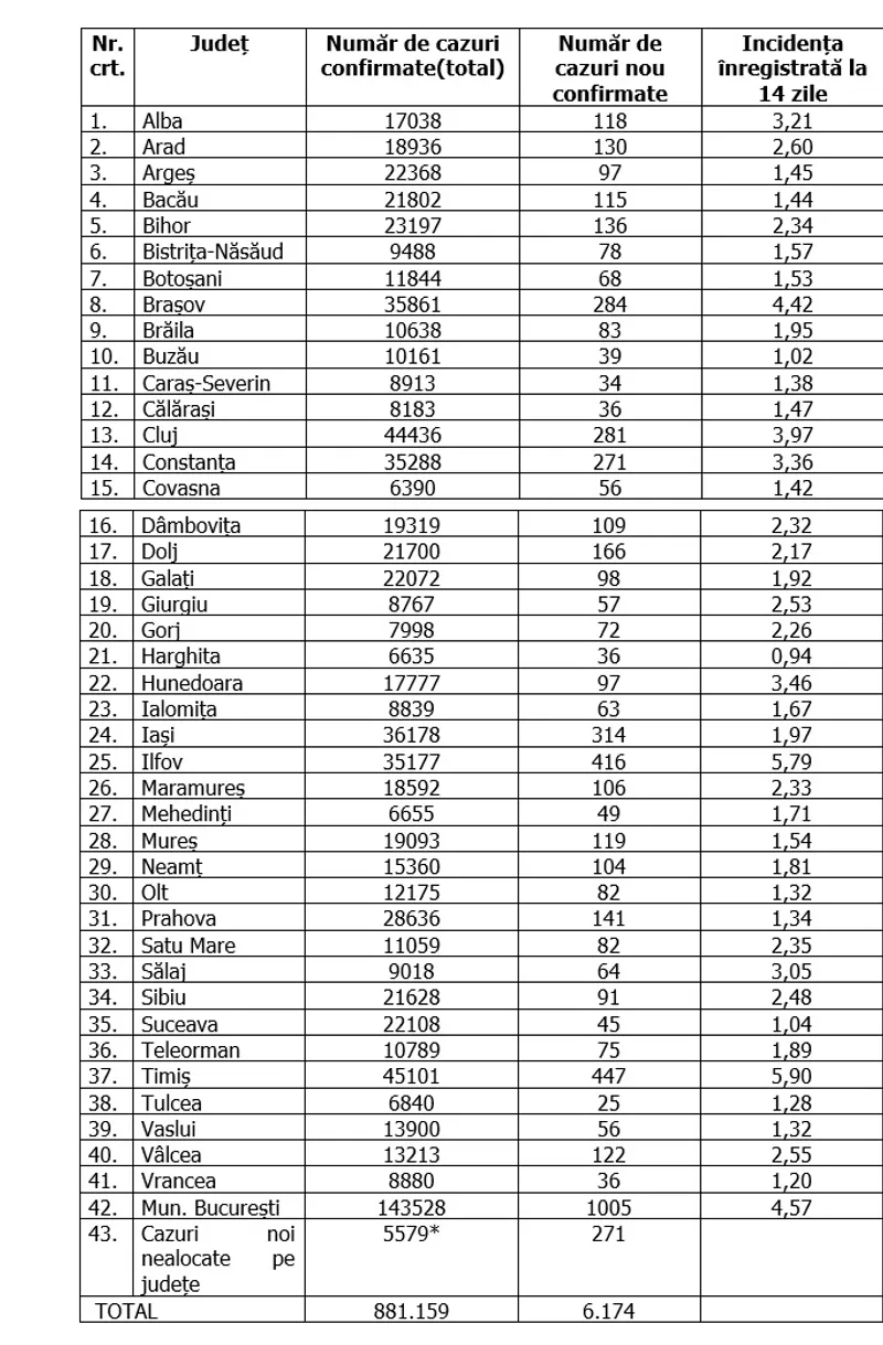 În total, în România au fost confirmate 881.159 de cazuri de infectare cu coronavirus, iar 21.877 de oameni infectați au murit.