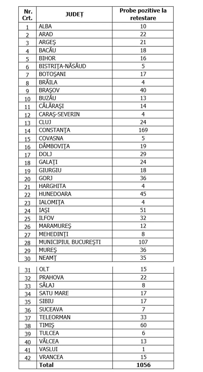 Distinct de cazurile nou confirmate, în urma retestării pacienților care erau deja pozitivi, 1.056 de persoane au fost reconfirmate pozitiv.