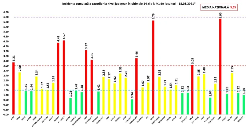Coeficientul infectărilor cumulate la 14 zile, raportate la 1.000 de locuitori este calculat de către Direcțiile de Sănătate Publică, la nivelul Municipiului București și al județelor. Mai jos aveți graficul realizat în baza raportărilor primite de CNCCI de la Direcțiile de Sănătate Publică: