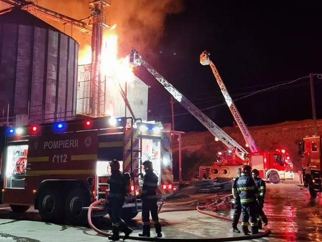 Incendiu puternic în județul Vaslui, la o hală și o moară. Peste 1.600 de tone de cereale pentru furaje pentru păsări au ars.
