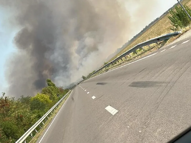 Pompierii intervin de urgență pentru stingerea unui incendiu de vegetație. Suprafața afectată este de 10 hectare, o porțiune aflată între o cale ferată și un drum național.