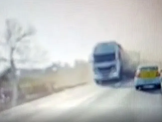 Imaginile video surprinse de o cameră de bord arată cum tirul din față, condus de fiu, frânează brusc și fără motiv. Ulterior, tirul din spate, condus de tatăl său, lovește duba din spate. Cabina utilitarei este zdrobită.