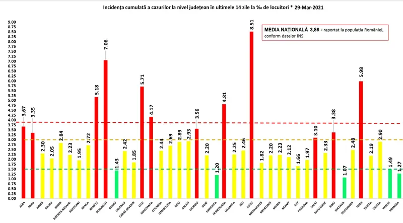 25 de județe sunt în scenariul galben, cele mai mari rate de infectare fiind în: Galați -2,93, Vîlcea - 2,90, Dolj -2,89, Bihor - 2,84.