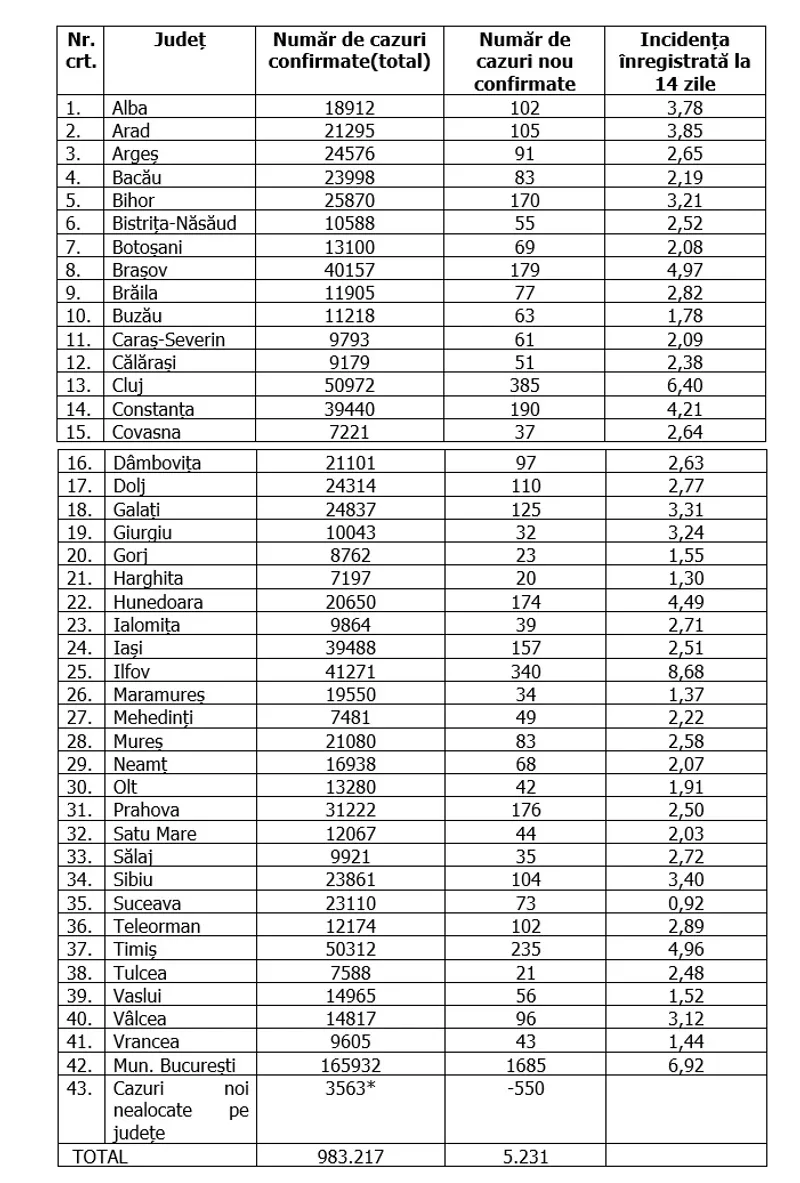 În ultimele 24 de ore, au fost confirmate 5.231 de cazuri noi de infectare cu coronavirus, iar județele care au raportat cele mai multe cazuri noi sunt: București - 1.685, Cluj - 385, Ilfov - 340, Timiș - 235.