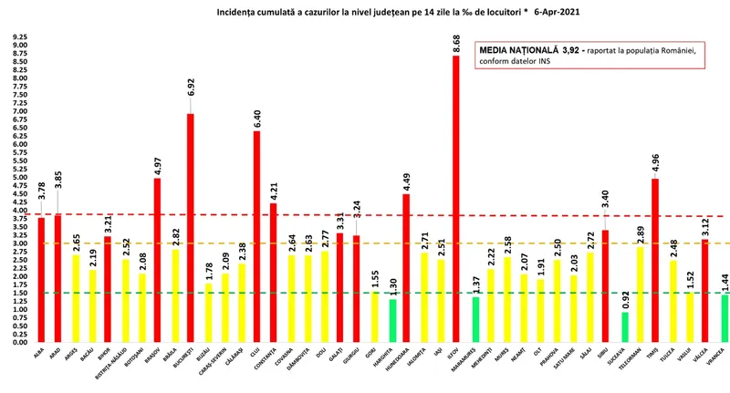 Județele cu cele mai mari rate de infectare sunt: Ilfov - 8,68, București - 6,92, Cluj - 6,40, Brașov - 4,97, Timiș - 4,96, Hunedoara - 4,49.