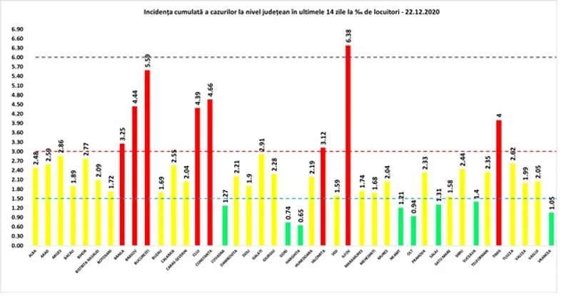 Coeficientul infectărilor cumulate la 14 zile, raportate la 1.000 de locuitori este calculat de către Direcțiile de Sănătate Publică, la nivelul Municipiului București și al județelor. Mai jos aveți graficul realizat în baza raportărilor primite de CNCCI de la Direcțiile de Sănătate Publică, conform Grupului de Comunicare Strategică: