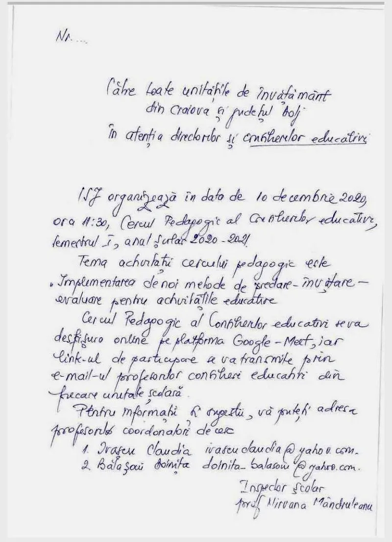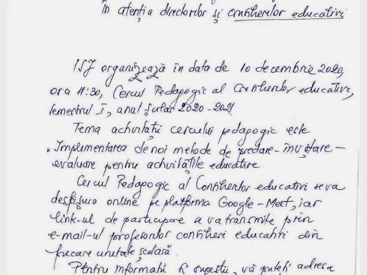 În nota telefonică scrisă cu pixul se anunță că: “ISJ Dolj organizează în data de 10 decembrie, ora 11.30, Cercul pedagogic al consilierilor educativi, semestrul I, anul școlar 2020-2021. Tema activității cercului pedagogic este: Implementarea de noi metode de predare-învățare-evaluare pentru activitățile educative. Cercul pedagogic al consilierilor educativi se va defășura online, pe platforma Google Meet, iar link-ul de participare se va transmite prin e-mailul profesorilor consilieri educativi din fiecare unitate școlară”.