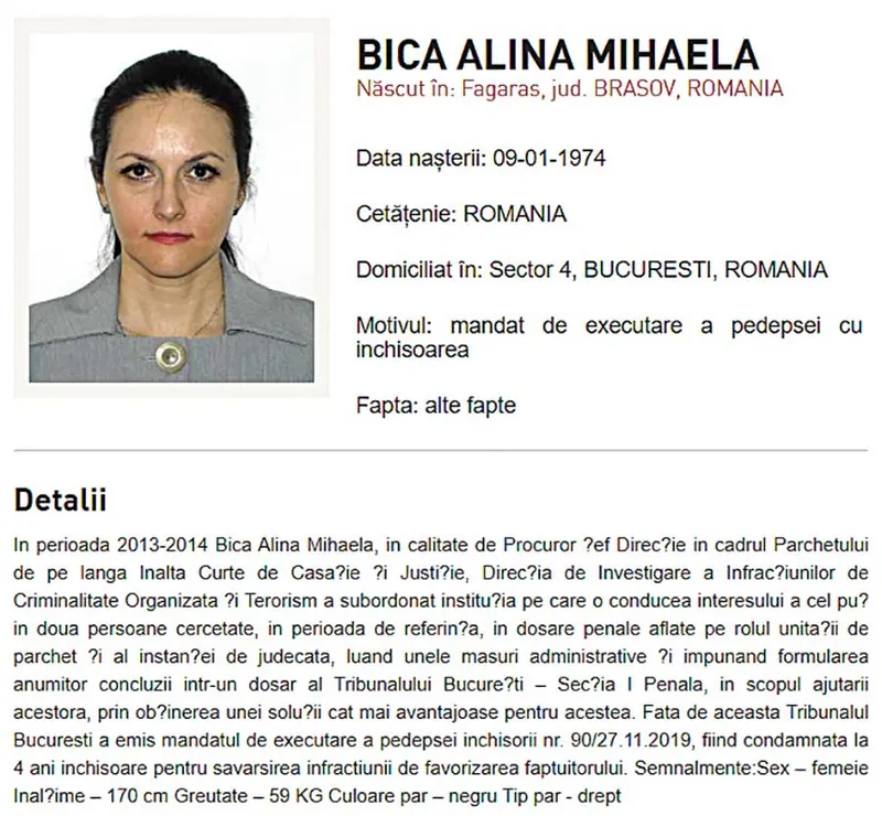 Fosta șefă a DIICOT, Alina Bica a fost dată în urmărire internațională în noiembrie 2019, după ce instanța supremă i-a respins apelul, menținând condamnarea de 4 ani de închisoare. Ea a fost prinsă și arestată la domiciliu în Italia, în iulie 2020. Alina Bica a cerut în instanță să execute pedeapsa în Italia.