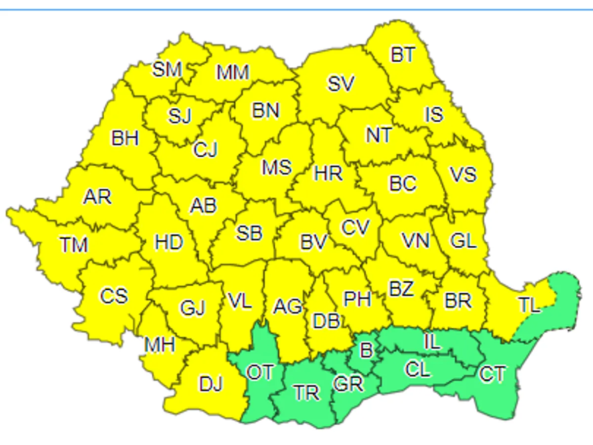 Totodată, meteorologii au emis o avertizare cod galben care va intra n vigoare vineri, la ora 12.00, şi este valabilă până sâmbătă, la ora 3.00.