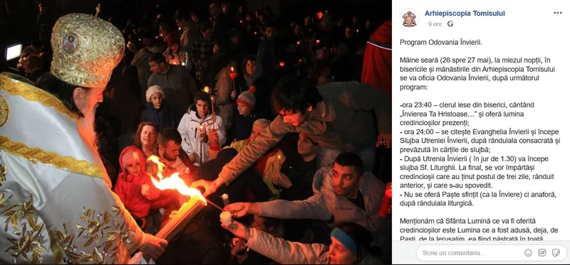 „Anul acesta, urmare a instituirii stării de urgență în contextul pandemiei de SARS-CoV-2, credincioșii nu au putut participa în comuniune deplină cu clerul la această slujbă. Prin urmare, pentru a repara acest neajuns, (...) în noaptea de 26 spre 27 mai, la miezul nopții, în bisericile și mânăstirile din Arhiepiscopia Tomisului se va oficia slujba începutului pascal și Sfânta Liturghie, clerul chemând credincioșii să primească Lumina Învierii ca în noaptea de Paști”, se arăta în mesajul de acum o săptămână al Arhiepiscopiei.