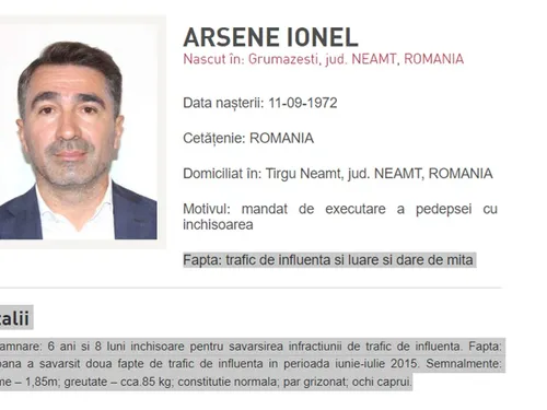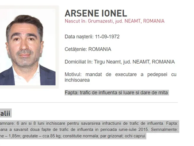 Preşedintele Consiliului Judeţean Neamţ, Ionel Arsene, a fost condamnat în 10 martie la şase ani şi opt luni de închisoare cu executare, în dosarul în care era judecat pentru trafic de influenţă. În 27 martie, a fost dat în urmărire, iar în 13 octombrie, ministrul Justiţiei a anunţat că la Curtea de Apel din Bari a fost decisă predarea sa autorităţilor din România, hotărârea nefiind definitivă.