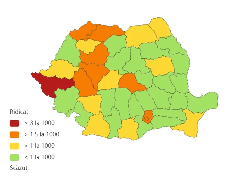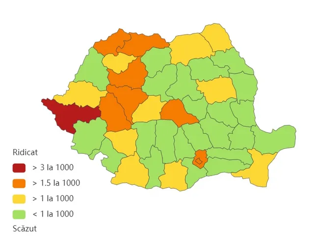 Județul Timiș, singurul în zona roșie, raportează o incidență de 3,99 cazuri la mia de locuitori, urmat de Maramureș, cu 2,95 la mie.