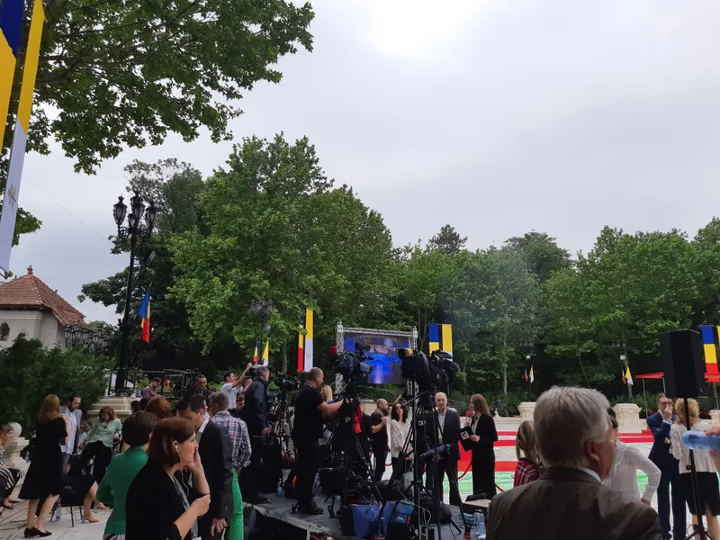 Sunt câțiva zeci de jurnaliști în țarcul amenajat în partea dreaptă a prezidiului cu două drepte, din catifea roșie, de unde va vorbi Papa Francisc, după întâlnirea cu președintele Klaus Iohannis, de pe Platoul Marinescu.