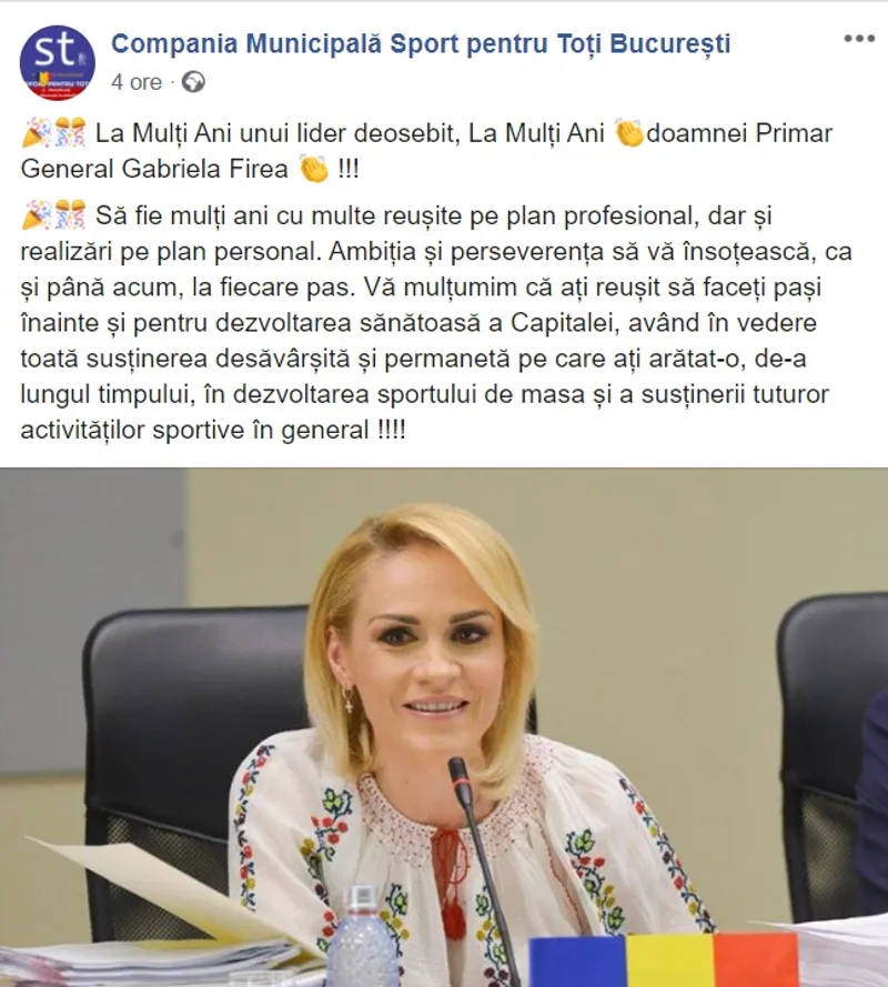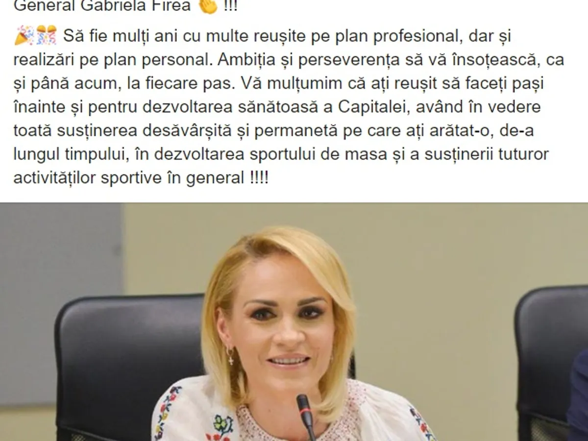 Compania de Sport a avut grijă să o laude pe Firea pentru „dezvoltarea sănătoasă a Capitalei”, spre deosebire de colegii de la Centrul de Dialog, care s-au mulțumit doar să îi ureze „La mulți ani”, „sănătate și mult succes”.