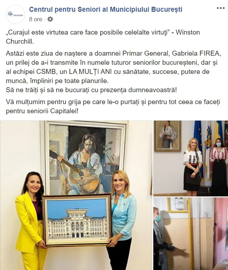 Centrul pentru Seniori al Municipiului București i-a scris chiar și un citat din Winston Churchill și a publicat mai multe fotografii cu primărița, în campaniile ei de imagine.
