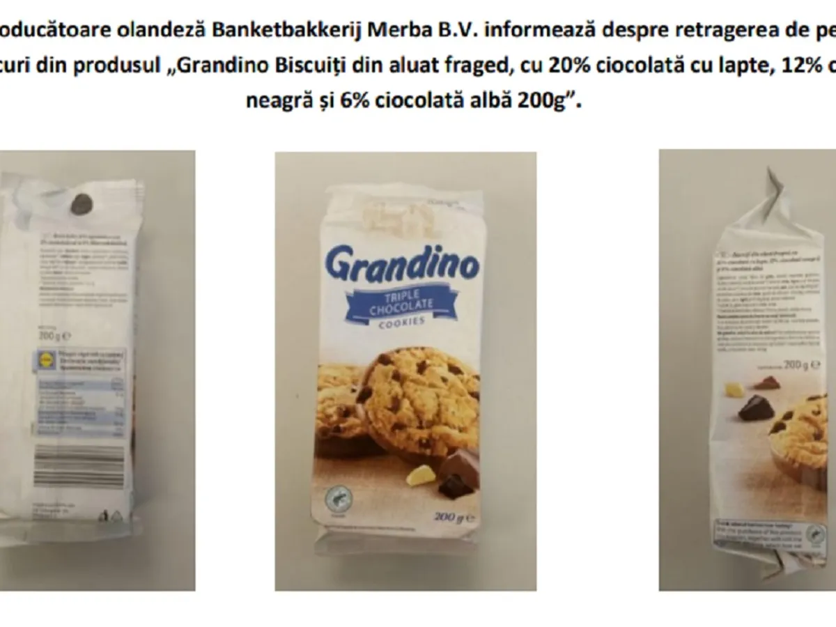 ”Această retragere de pe piață vizează exclusiv produsul „Grandino Biscuiți din aluat fraged, cu 20% ciocolată cu lapte, 12% ,ciocolată neagră și 6% ciocolată albă 200g” cu termenul de valabilitate 12.12.2024 de la producătorul Merba B.V.