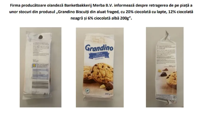 Conform unui anunț ANSVSA, Oostherhout, firma producătoare olandeză Banketbakkerij Merba B.V. retrage în prezent de pe piață produsul „Grandino Biscuiți din aluat fraged, cu 20% ciocolată cu lapte, 12% ,ciocolată neagră și 6% ciocolată albă 200g” cu termenul de valabilitate 12.12.2024.