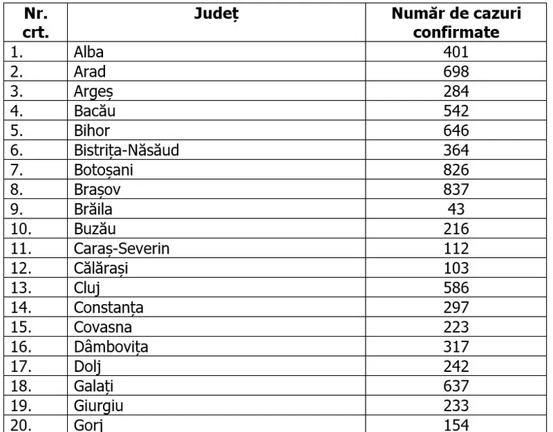 Județul cu cel mai mare număr de cazuri confirmate și cu cele mai multe decese este Suceava - 3.612 cazuri confirmate și 230 de decese, urmat de Capitală, unde sunt 2.238 de cazuri confirmate și 91 de decese.