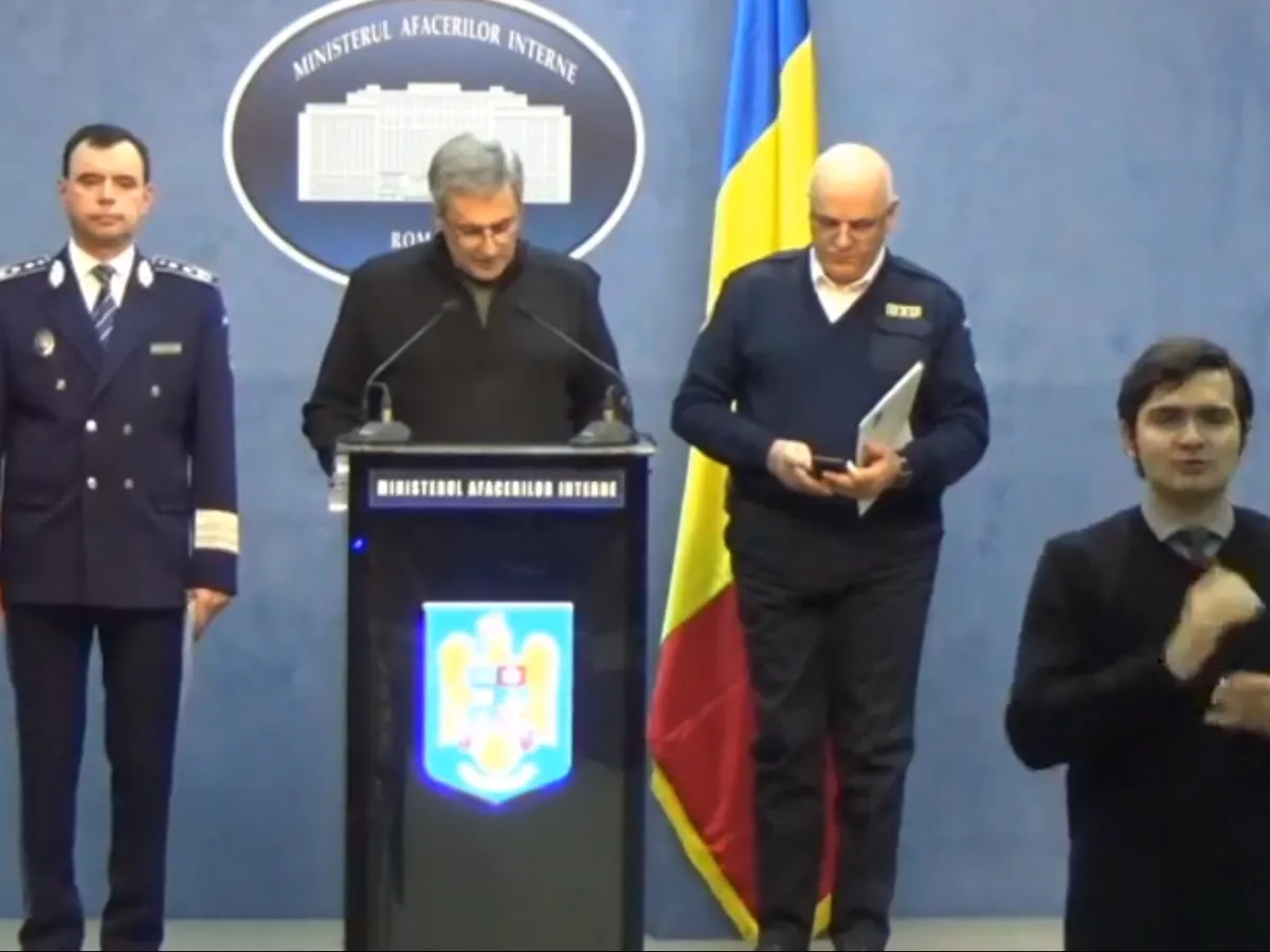 Declarația de presă de la sediul Ministerului de Interne este susținută de ministrul Marcel Vela și de secretarii de stat Bogdan Despescu și Raed Arafat.