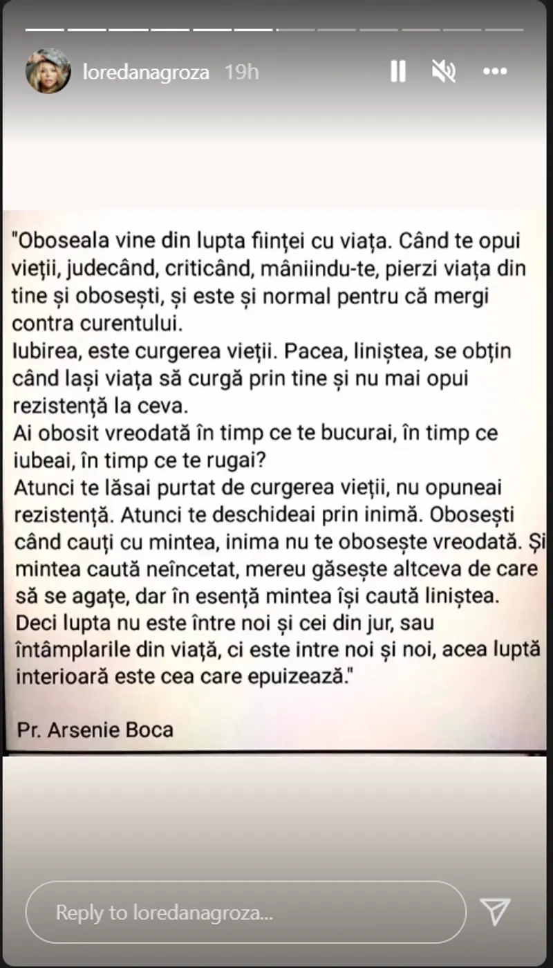 În același timp cu clipul de pe TikTok, la capitolul stories de pe Instagram, Loredana are poze cu mai multe feluri de mâncare, dar și cu un citat din Arsenie Boca.
