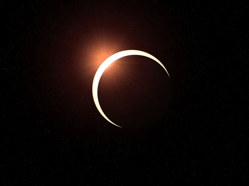 Pentru că nu vorbim despre o eclipsă totală, Luna va acoperi doar 91% din suprafața Soarelui, efectul fiind acel "inel de foc" rămas neacoperit.