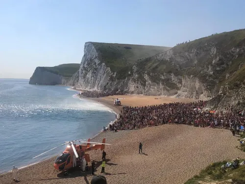 Patru persoane au fost rănite, sâmbătă, după ce au sărit de pe stânca Durdle Door din Dorset. Ulterior, poliția a intervenit și a evacuat plaja, pe care se adunaseră câteva sute de oameni, pentru ca un elicopter să poată prelua răniții, a scris presa locală.