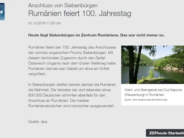 „Ministerul Afacerilor Externe a luat notă cu consternare de articolul de presă publicat de Agenţia Germană de Presă (DPA – Deutsche Presse-Agentur) şi preluat de postul public de televiziune german ZDF (Zweites Deutsches Fernsehen) cu privire la aniversarea Centenarului Marii Unirii, care nu reflectă adevărul istoric, respectiv manifestarea de voinţă a Transilvaniei de unire cu România.