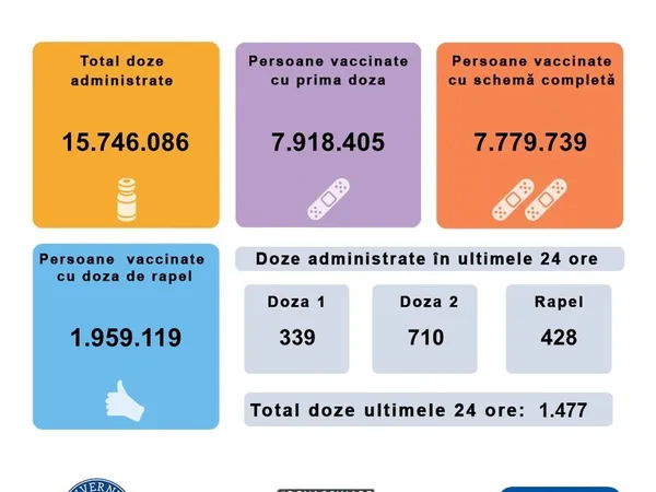 De la debutul campaniei de vaccinare au fost folosite 15.746.086 doze de vaccin, fiind complet imunizate cu ambele doze 7.779.739 persoane, alte 1.959.119 făcând şi cea de-a treia doză de vaccin.
