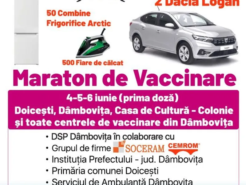 "Evenimentul va avea loc la Casa de Cultură Colonie, localitatea Doiceşti, şi în toate centrele de vaccinare din judeţul Dâmboviţa, fără programare, doar cu cartea de identitate”, informează Direcţia de Sănătate Publică.