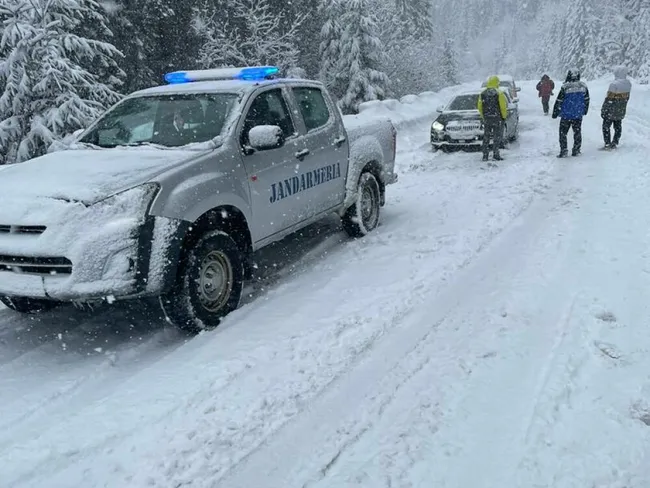 Mai mulţi turişti din judeţul Dolj şi din Bucureşti, care se întorceau marţi de la pârtia Transalpina, au rămas cu maşinile înzăpezite pe drumul către staţiunea Voineasa, fiind ajutaţi de jandarmii montani să îşi continue în siguranţă drumul.