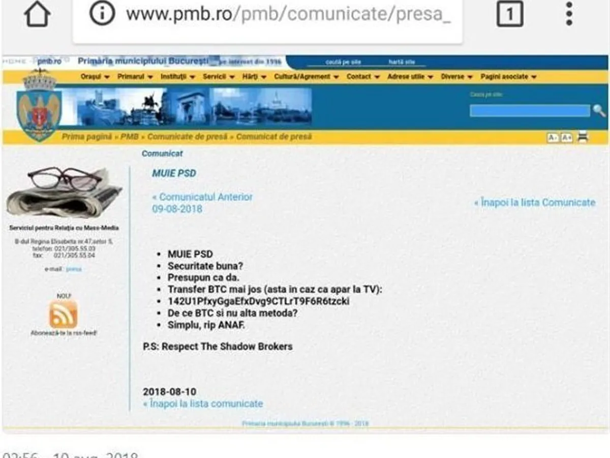 „Securitate bună? Presupun că da. Transfer de BTC mai jos (asta în caz că apar la TV). De ce BTC și nu altă metodă? Simplu, RIP ANAF. PS: Respect The Shadow Brokers", este mesajul care a apărut în comunicat.
