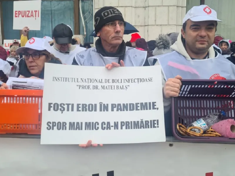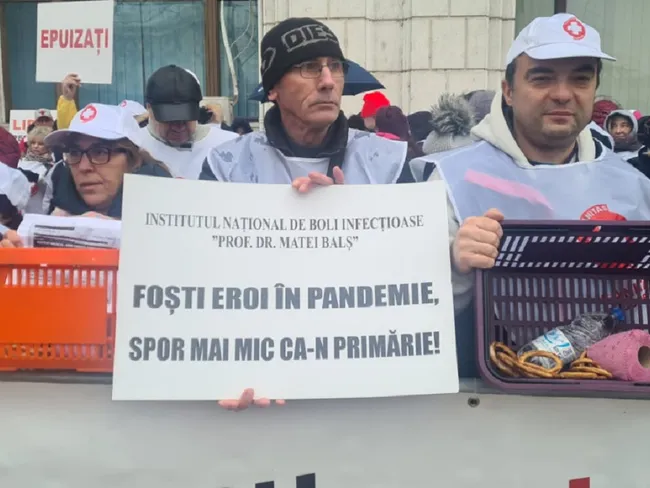 ”Foşti eroi în pandemie, spor mai mic ca-n primărie”, ”Epuizaţi”, ”Nu lăsaţi sănătatea să moară”, scria pe pancartele sindicaliștilor de la Sanitas care au protestat în fața Ministerului Finanțelor.