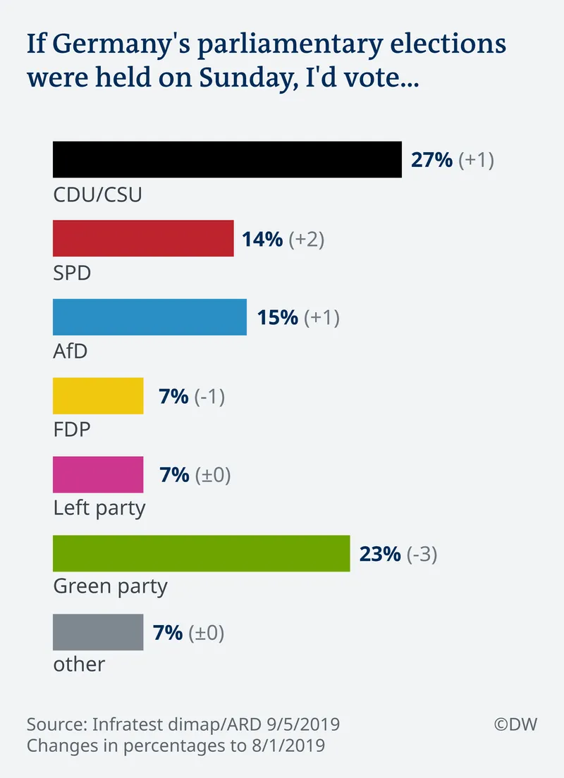 Dacă duminica viitoare ar avea loc alegeri generale în Germania, CDU, SPD și AfD ar înregistra doar mici progrese față de sondajul similar din august. AfD ar primi 15% din voturi iar CDU 27%, față de cele 23 de procente ale ecologiștilor, cu trei mai puține decât în august. Verzii ar rămâne însă a doua forță politică. Spre comparație: la alegerile generale din septembrie 2017, ecologiștii au obținut doar 8% din sufragii, fiind în prezent cel mai mic grup parlamentar din Bundestag.