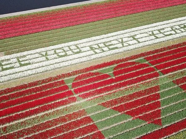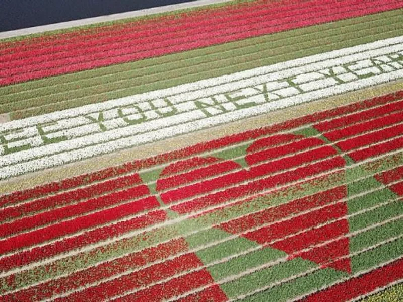 Mesaj scris cu lalele pentru turiștii care nu pot vizita anul acesta fermele de flori din Olanda