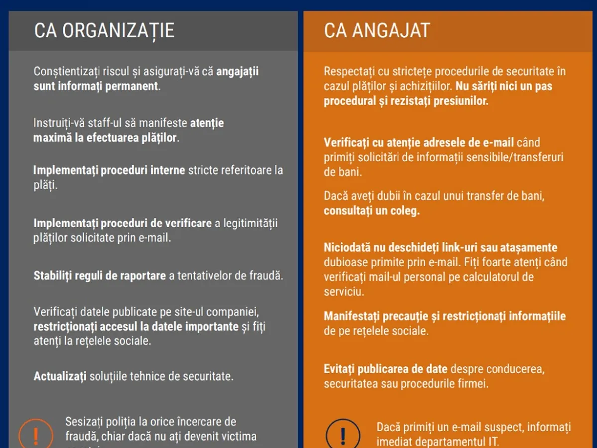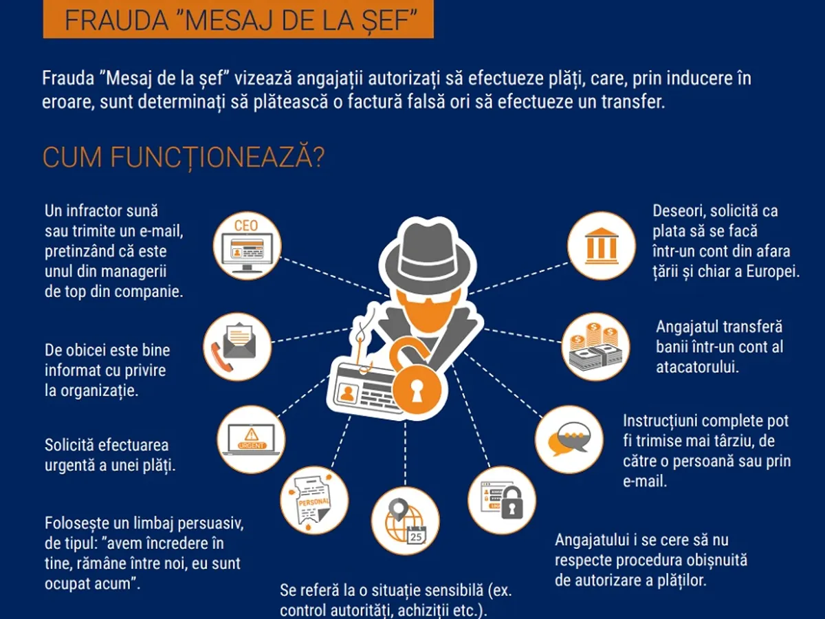 ”Frauda „Mesaj de la șef” vizează angajații autorizați să efectueze plăți, care, prin inducere în eroare, sunt determinați să plătească o factură falsă ori să efectueze un transfer”, transmite sursa citată.