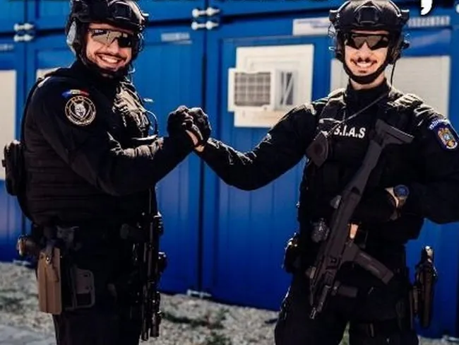 MAI a distribuit o fotografie în care apar doi angajaţi de la Serviciul pentru Intervenţii şi Acţiuni Speciale, aşa-numiţii ”mascaţi”. Cei doi sunt înarmaţi şi poartă echipamentul standard.