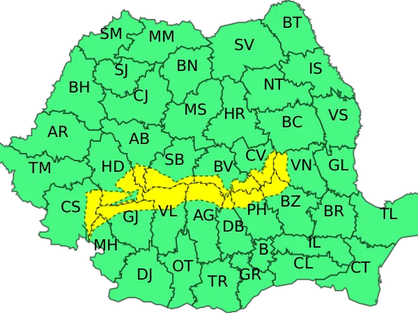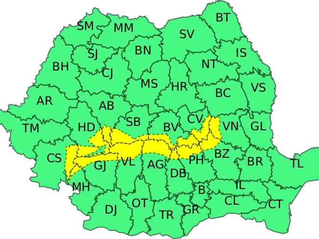 Judeţele ce se vor afla, parţial, sub Codul galben de viscol şi transport de zăpadă sunt: Caraş-Severin, Mehedinţi, Gorj, Hunedoara, Vâlcea, Alba, Sibiu, Braşov, Argeş, Dâmboviţa, Prahova, Covasna, Buzău şi Vrancea.