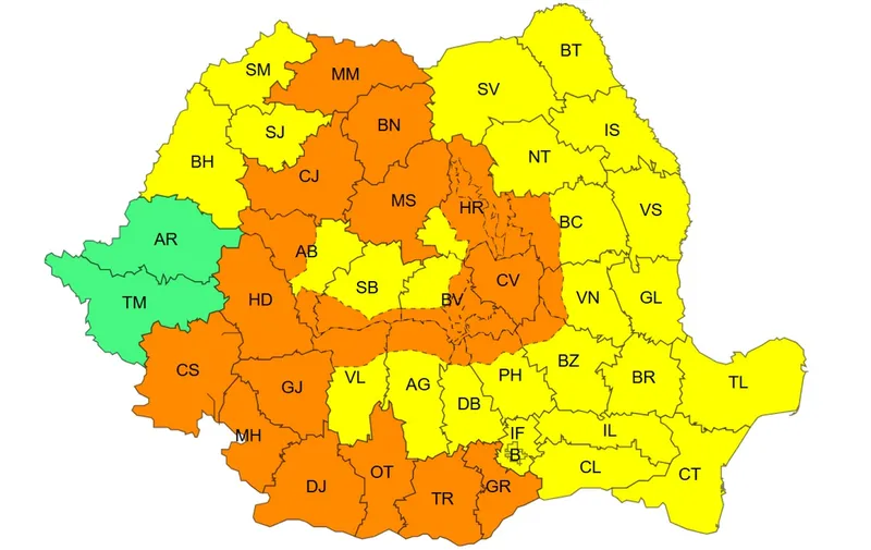 Conform prognozei de specialitate, în intervalul orar 14:00 - 21:00, va fi Cod portocaliu de instabilitate atmosferică accentuată și averse importante cantitativ în județele Caraș-Severin, Hunedoara, Cluj, Mureș, Bistrița-Năsăud, Maramureș, Covasna, precum și la munte.