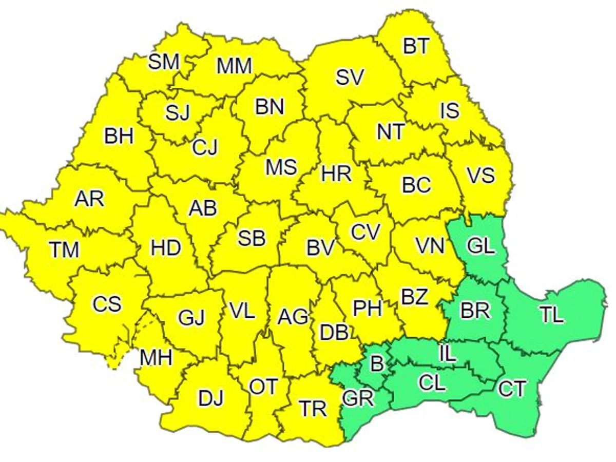 Conform prognozei de specialitate, în perioada 15 august, ora 10:00 - 16 august, ora 10:00, în cea mai mare parte a ţării se vor semnala averse cu caracter torenţial, descărcări electrice, intensificări de scurtă durată ale vântului, vijelii şi grindină.
