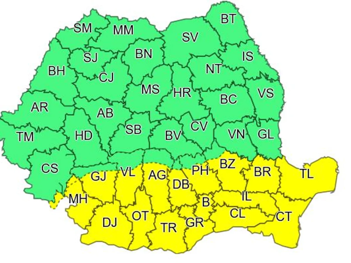 Lista zonelor afectate de Codul galben cuprinde judeţele Argeş, Brăila, Buzău, Călăraşi, Constanţa, Dâmboviţa, Dolj, Gorj, Giurgiu, Ialomiţa, Mehedinţi, Olt, Prahova, Tulcea, Teleorman, Vâlcea, precum şi Municipiul Bucureşti.
