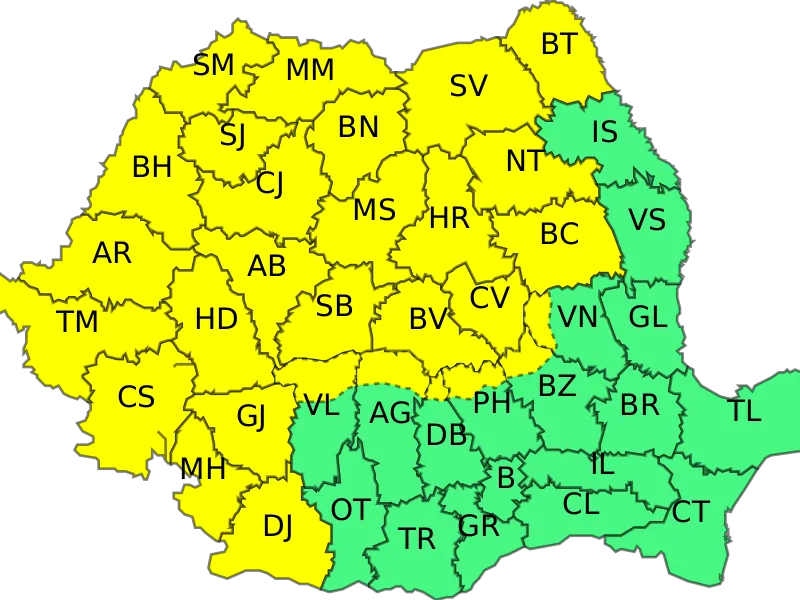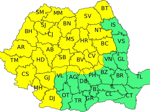 Judeţele avertizare sunt: Alba, Argeş, Arad, Bacău, Bihor, Bistriţa-Năsăud, Botoşani, Braşov, Buzău, Cluj, Caraş-Severin, Covasna, Dâmboviţa, Dolj, Gorj, Hunedoara, Harghita, Mehedinţi, Maramureş, Mureş, Neamţ, Prahova, Sibiu, Sălaj, Satu Mare, Suceava, Timiş,Vâlcea şi Vrancea.