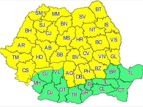Un număr de 32 de judeţe se află sub ”Cod galben de instabilitate atmosferică” până marţi dimineaţa, potrivit unei avertizări emise de Administraţia Naţională de Meteorologie (ANM).